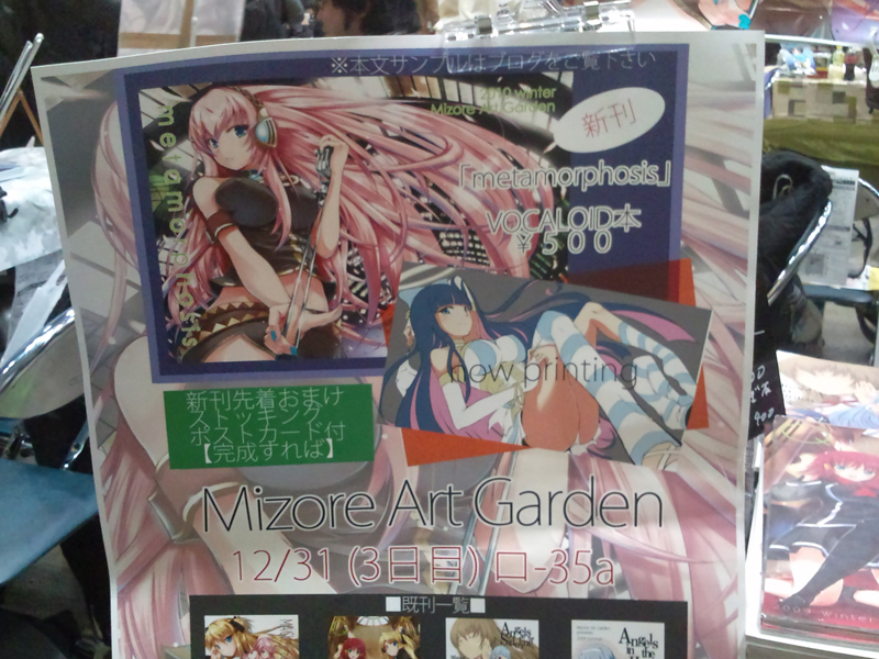 仕事を今年から有難いことに受けるようになって 今年の2月から仕事絵ばっか描いてました。 その最新のモノが公開されたので宣伝しておきます~ 株式会社CAVE様より本日リリースされる「放課後の紙芝居部」 の白雪姫の作画を担当しました!声優にゴトゥーザ様こと後藤邑子さん、イカ娘の金元寿子さんと豪華です!是非遊んでみてください。 http://www.cave-world.com/jp/apps/houkago_no_kamishibaibu/ ※画像は一部切り取ってあります ファミ通.comにも私の絵が掲載されております http://www.famitsu.com/news/201107/20047070.html そんなわけでまだ夏コミは取り掛かれてません・・・!間に合うのか・・・! 今やってる絵仕事がもう9割終わってるのでそれが終わり次第 とりかかります。表紙は今月中、中身の公開は8月11日あたりになりそうです。ギリギリ! あけましておめでとうございます冬コミお疲れさまでした! そしてあけましておめでとうございます。 2011年になっちゃいましたね~ 去年末の冬コミではみなさん来て頂いて有難うございました! QMAと同じくらいの人たちに手にとってもらえて初のコミケボカロ参加でしたが 非常に有難かったです^^ 既刊もいくつか完売しました。有難う御座います! あと「いつもみてます」 とか 「pixivみてます」 とか声をいつもより頂けて・・・というかボカロで描いてからpixiv見てます って結構多く仰って頂けて励みになってます。 コミケでスケブは受け付けてないですけど(ボマスとかサンクリ、コミ1では受けてます) そういう風に声を掛けていただけるだけで元気が出ます。 今TOPにあるストッキング絵の先着おまけポストカードも 再来週1/16のボマスで再配布(少々ですが)しますので 「冬コミでもらえなかったよー」って人は新刊をボマスで提示して下されば差し上げますー (ボマスでそのとき残ってれば:ボマスでも先着です) あとはー色々書くことはついったで言ってるのでそっちでw とりあえず次のイベントは1/16のボーマス15です。 配置とかはINFOをご覧下さい。 新刊手に入らなかった方はドウゾ。 イベントに来れない遠方の方はメロンブックスに新刊既刊を委託してますので宜しければどうぞー↓ http://shop.melonbooks.co.jp/shop/list/?DA=chgitemtype&G=&F=mizore+art+garden 既刊だけならとらのあなに置いてますのでご利用下さい。 ではでは今年もよろしくお願いします。 あ、新年絵とは関係ありませんがストッキングの壁紙作ったのでTOP絵をクリックして DLして使ってやって下さい。 冬コミ情報なんとか脱稿しました!